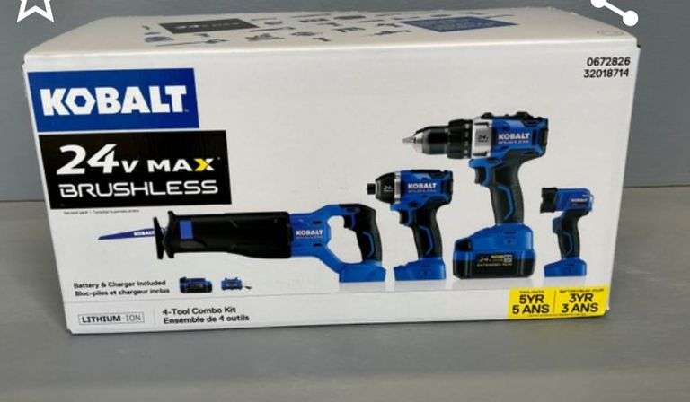 Kobalt 24V Max Brushless 4-tool combo kit, includes drill/driver, 1/4" impact driver, reciprocating saw, LED work light, 24V Max 4.0Ah lithium-ion extended run battery, and charger (retails at $499.99),