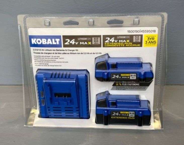 LOT 941 - Kobalt 24-Volt 2-Pack Lithium-ion (4.0 Ah + 4.0 Ah) Battery and Charger Kit -Retails $189.99