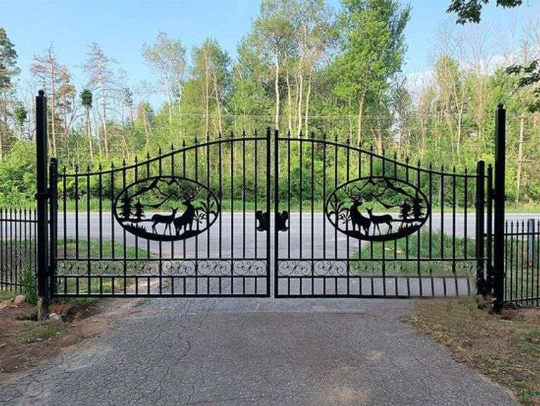 LOT 93 - Unused 2025 20ft Bi-Parting Iron Gate. With artwork "Deer " in the Middle of Gate Frame